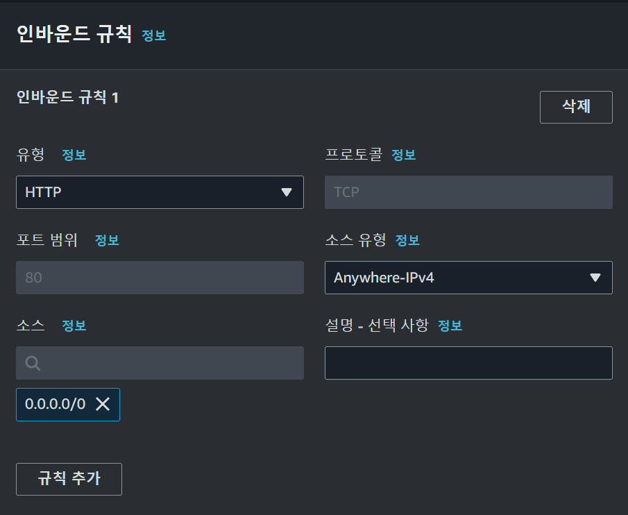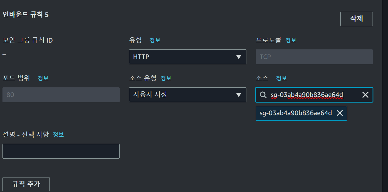 * 보안그룹이 안뜬다면 보안그룹 옆에있는 새로고침 누르기