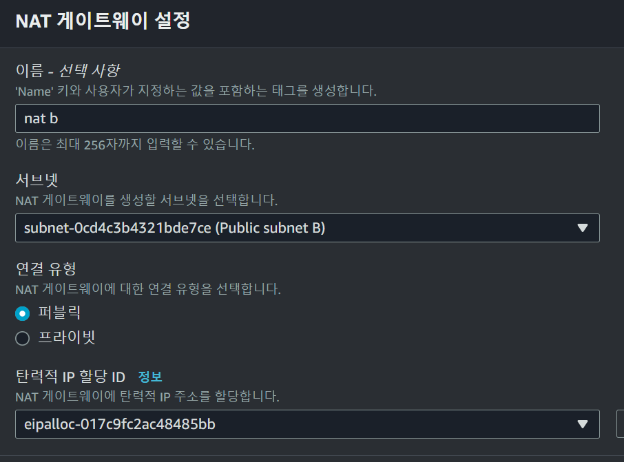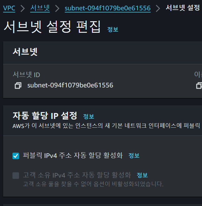 퍼블릭 서브넷들은 서브넷 설정 편집 -> 자동 할당 활성화 해준다