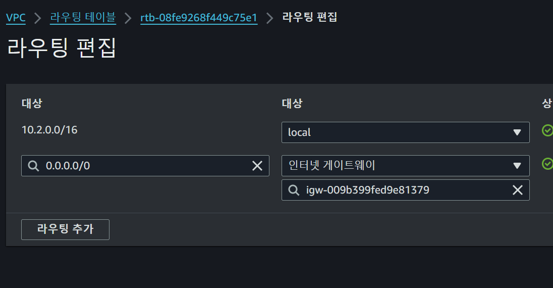 라우팅 테이블 -> 퍼블릭A,B 라우팅테이블에 라우팅 설정 편집 ->로컬은 냅두고 0.0.0.0/ + igw 설정