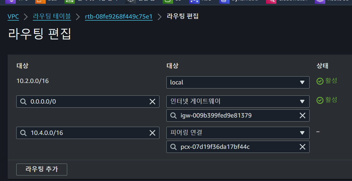 public b, private b 라우팅 테이블에 라우팅 편집에 들어가서 붙여넣고 -> 피어링 연결에 생성된 피어링을 선택해준다